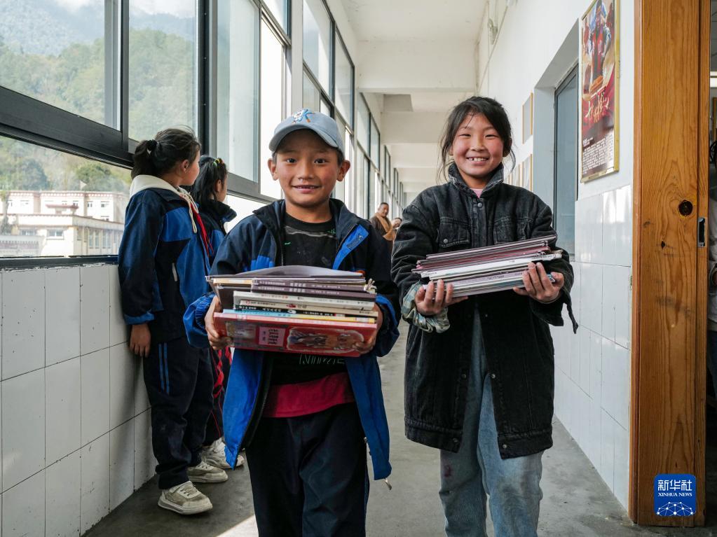 3月31日,學(xué)生們正在向教室的圖書(shū)角搬運(yùn)新圖書(shū)。新華社記者 洛卓嘉措 攝