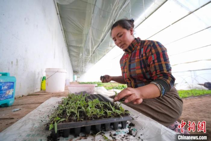 西藏阿里地區(qū)改則縣生態(tài)農牧業(yè)產(chǎn)業(yè)園溫室大棚內的工作人員正在進行育苗工作。何蓬磊 攝