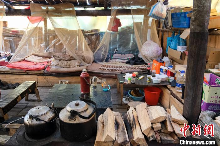 德瑪龍6號執(zhí)勤點木板房是大家在森林里的庇護(hù)所,進(jìn)入后可以看到房內(nèi)左右兩側(cè)布置了兩排通鋪,每人的床位由一個罩式蚊帳以及被褥組成,屋子中間有個藏式爐子,里面燒著并不干燥的木柴。