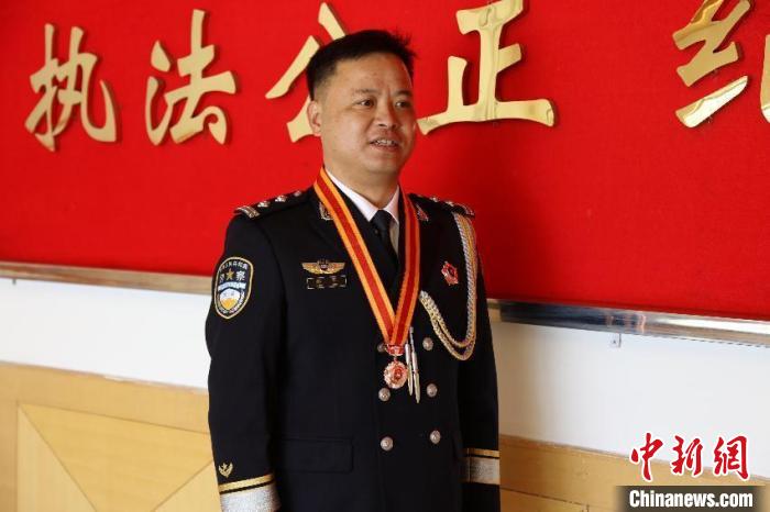 圖為獲得銅質(zhì)紀(jì)念章的民警楊軍?!「駸?攝