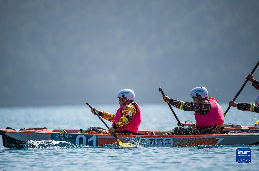 4月15日,選手們?cè)?00米靜水雙人漂流艇競(jìng)速賽中(無人機(jī)照片)。新華社記者 孫非 攝