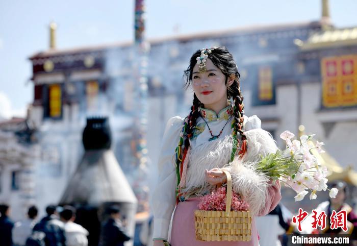 4月17日,游客身著藏式元素服裝在拉薩大昭寺廣場(chǎng)拍照留念。 李林 攝