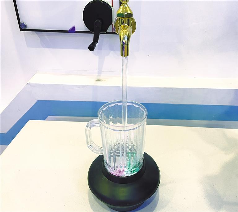 “這個體驗項目叫‘天上來水’。設計者巧妙設計水流通過水泵及透明玻璃管壓入水龍頭內,在封閉的水龍頭出口處將水溢出管口,溢出的水又將玻璃管隱蔽,水流的循環(huán)造成觀眾難以發(fā)現(xiàn)特殊裝置的奧秘,從而形成人為制造的錯覺?!斌w驗結束后,索央向小朋友解釋“天上來水”的科學原理。