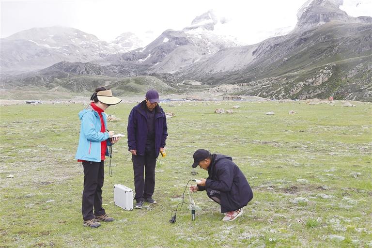 科研人員正在進(jìn)行植被覆蓋度及土壤濕度觀測。圖由受訪者提供