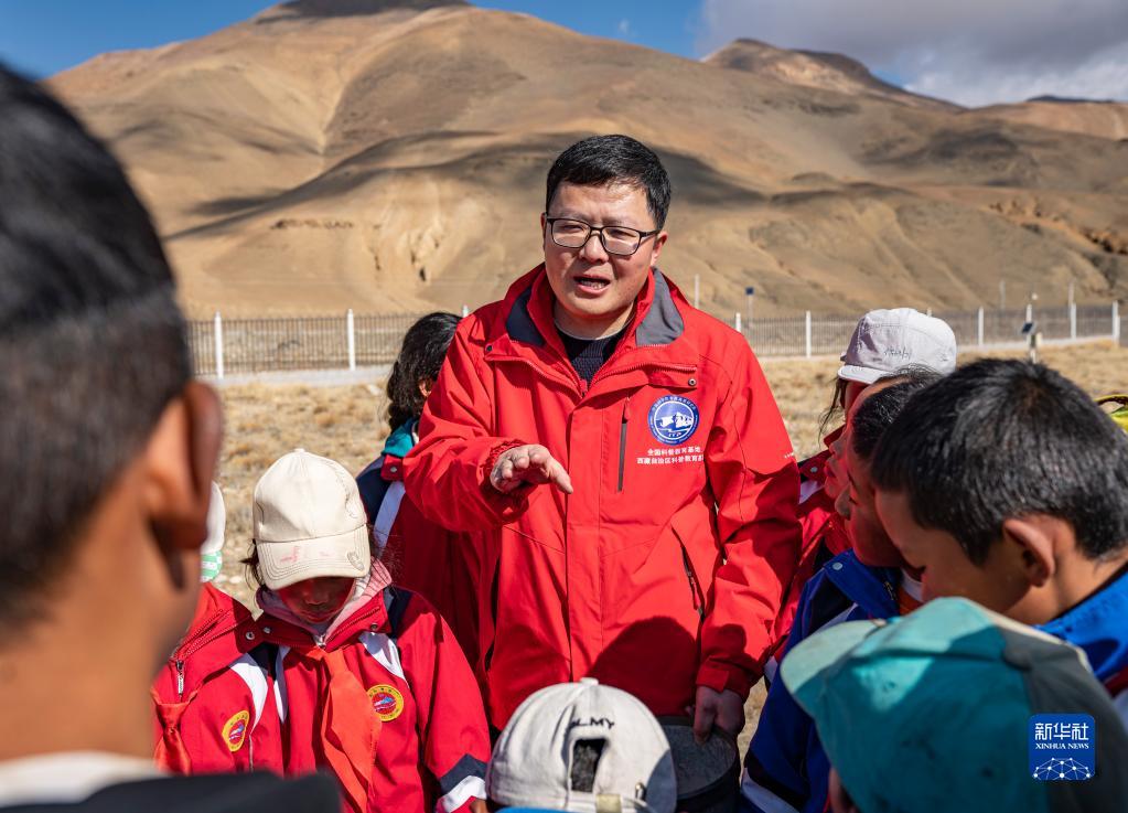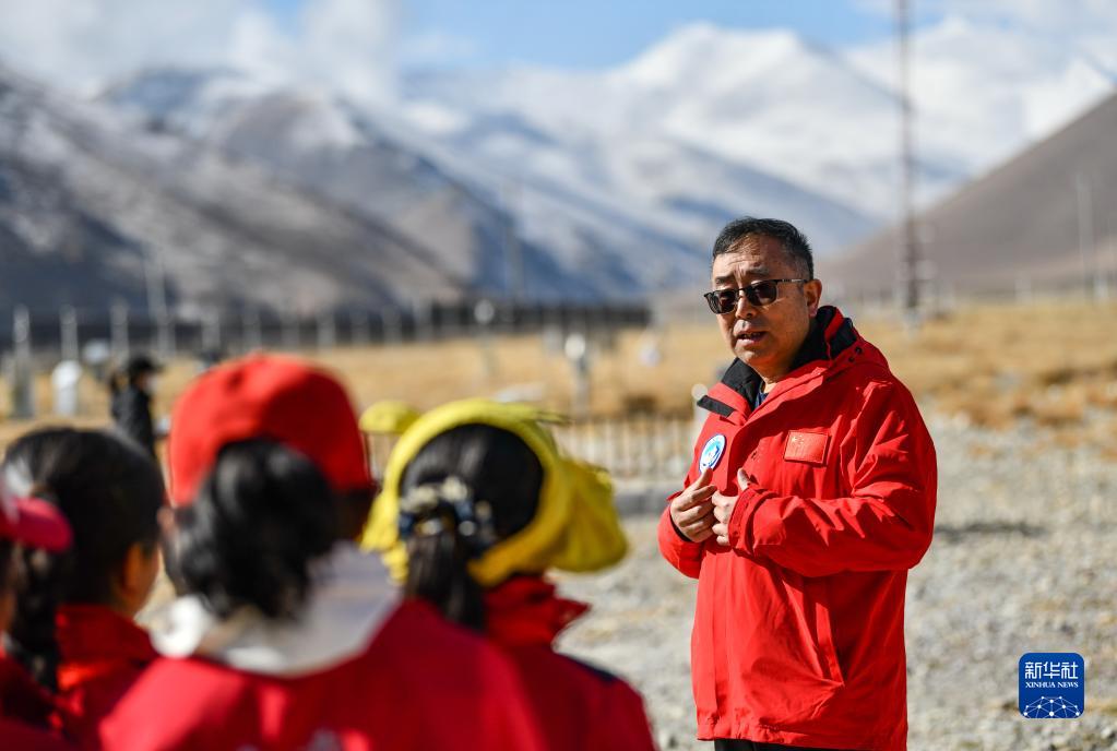 5月15日,珠峰站工作人員席振華給孩子們講解科學(xué)儀器的功能作用。新華社記者 晉美多吉 攝