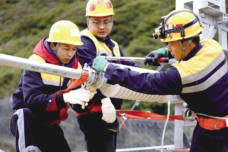 在接觸網(wǎng)支柱頂端,王偉雙手環(huán)抱著絕緣子,工友蔣瀟和次仁加布用專業(yè)套筒快速拆掉螺母,三人鉚足了勁合力將重達45公斤的絕緣子拆了下來。與此同時,次仁加布把舊絕緣子放在一邊,將新絕緣子送到位置,開始緊固、上端緊固到位、下端緊固到位……短短幾分鐘,他們就完成了絕緣子更換作業(yè)。望著自己的勞動成果,幾人臉上露出滿意的笑容。