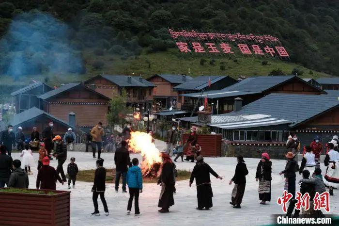 圖為2021年8月5日,西藏自治區(qū)隆子縣玉麥鄉(xiāng)民眾圍著篝火歡快地跳鍋莊舞。江飛波 攝