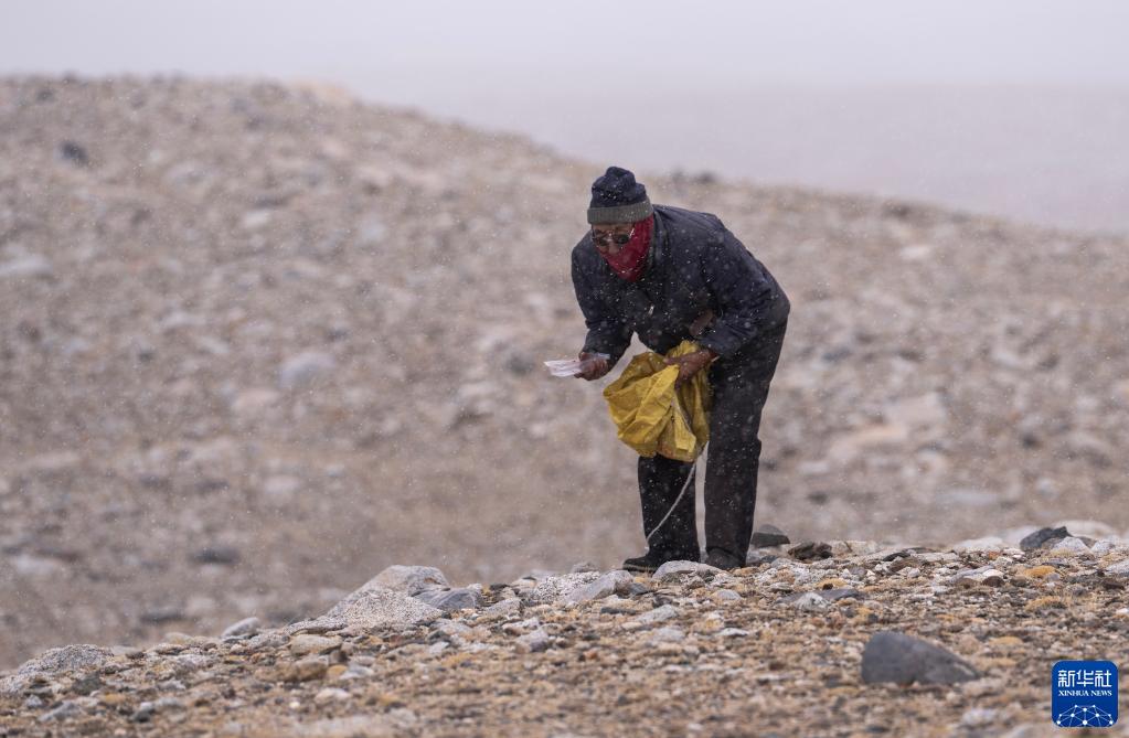 5月31日,乃乃老人在杰瑪央宗冰川附近撿拾垃圾。新華社記者 費茂華 攝