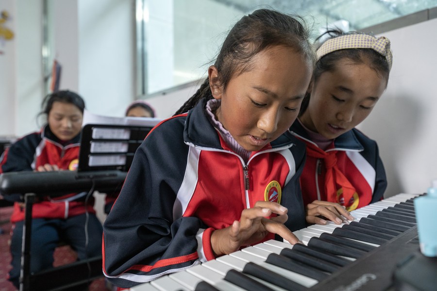 6月5日,扎西宗鄉(xiāng)完全小學的學生在上鋼琴課。