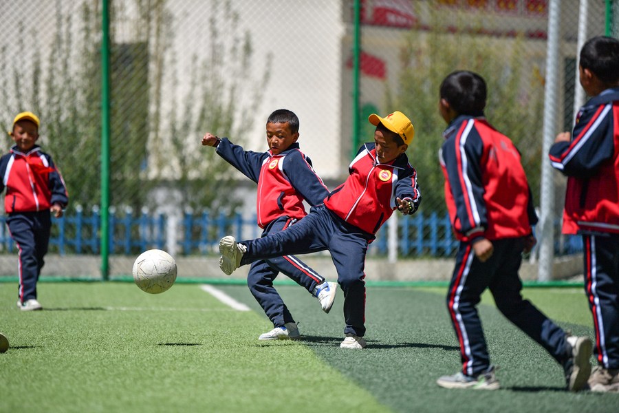 6月5日,扎西宗鄉(xiāng)完全小學的學生在人工草坪上踢足球。