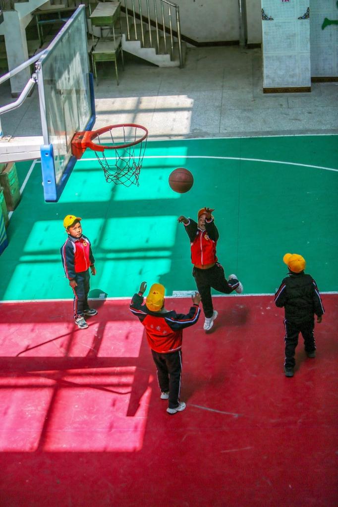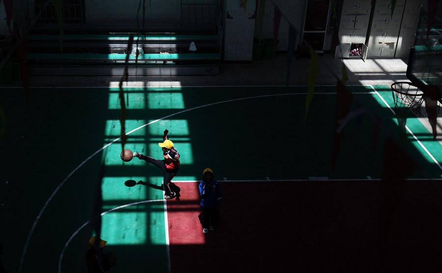 6月5日,扎西宗鄉(xiāng)完全小學的學生在室內(nèi)體育館上籃球課。