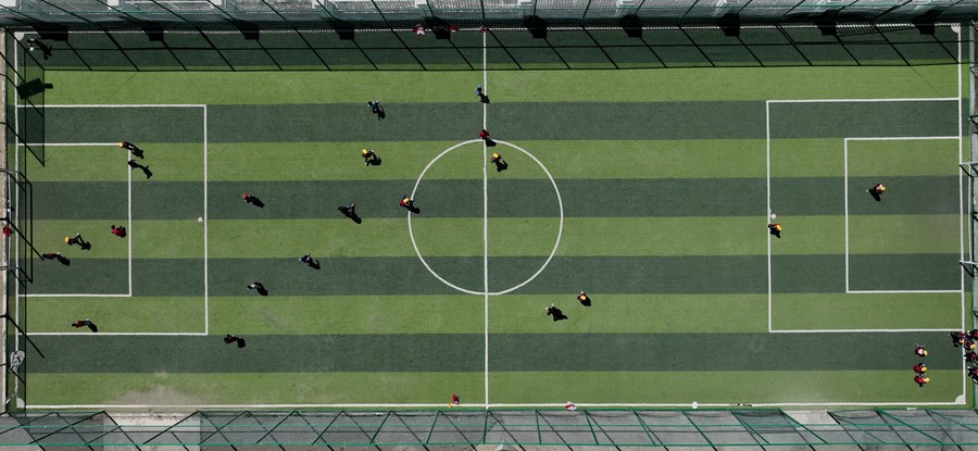 扎西宗鄉(xiāng)完全小學的學生在體育課上踢足球(6月5日攝,無人機照片)。