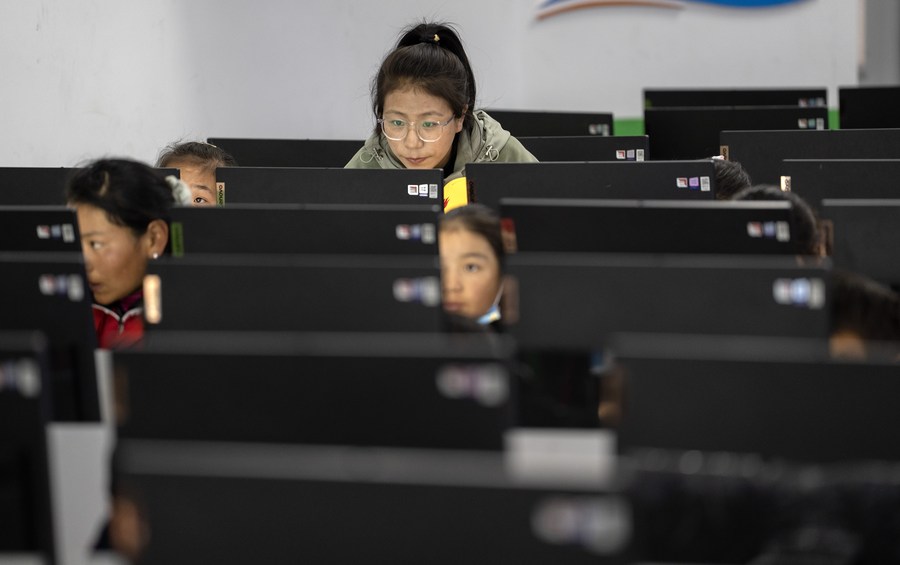 6月5日,拉巴卓瑪老師在給扎西宗鄉(xiāng)完全小學六年級的學生上計算機課。