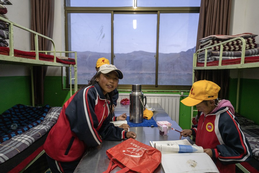 6月5日,扎西宗鄉(xiāng)完全小學的學生在宿舍學習。