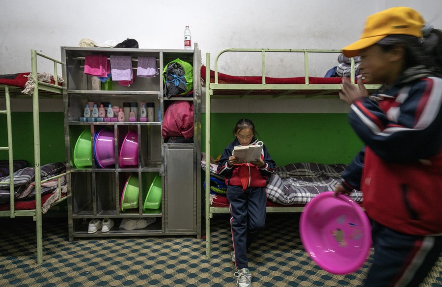 6月5日,扎西宗鄉(xiāng)完全小學學生在宿舍看書。