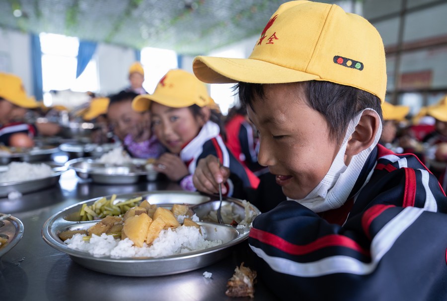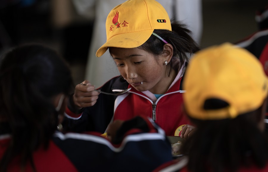 6月5日,扎西宗鄉(xiāng)完全小學的學生在食堂吃午飯。
