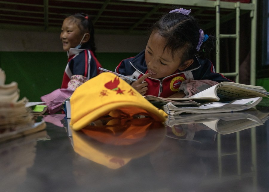 6月5日,扎西宗鄉(xiāng)完全小學學生在宿舍學習。