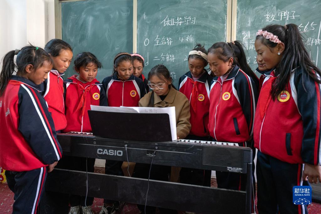 鋼琴課教室里又響起了歡快的樂曲聲,那是巴桑老師在教旦增吉宗和她的小伙伴們一首當?shù)馗枨段业募以谌湛t》:“你的家在哪里,就在日喀則呀……日喀則是好地方……”