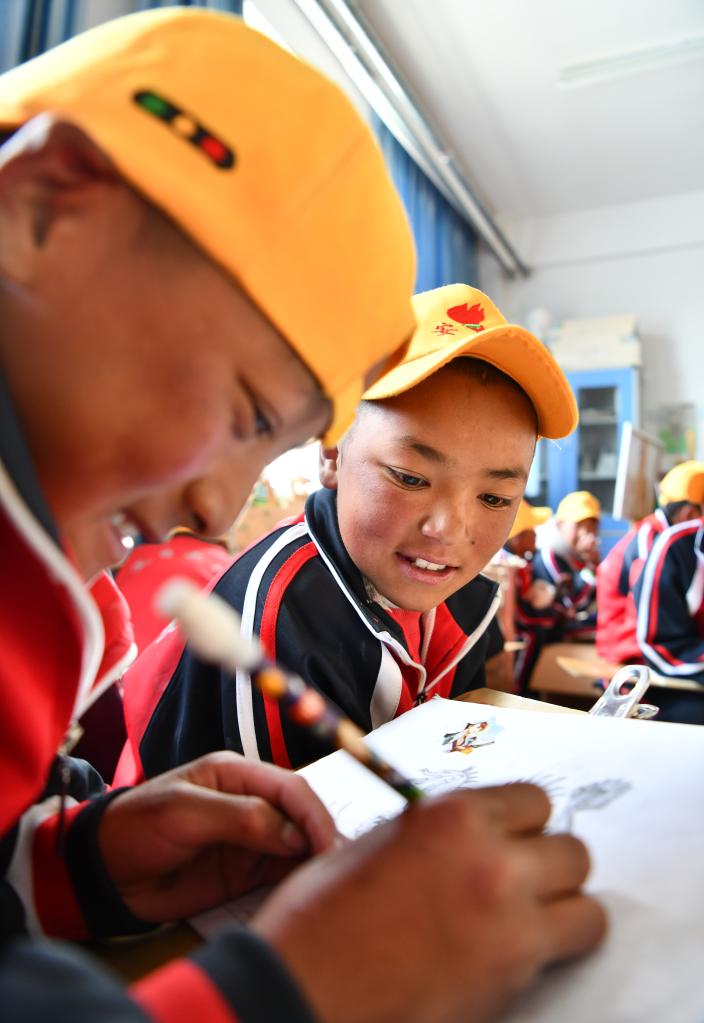 6月5日,阿旺尼曲(左一)在上美術(shù)課。新華社記者 費茂華 攝