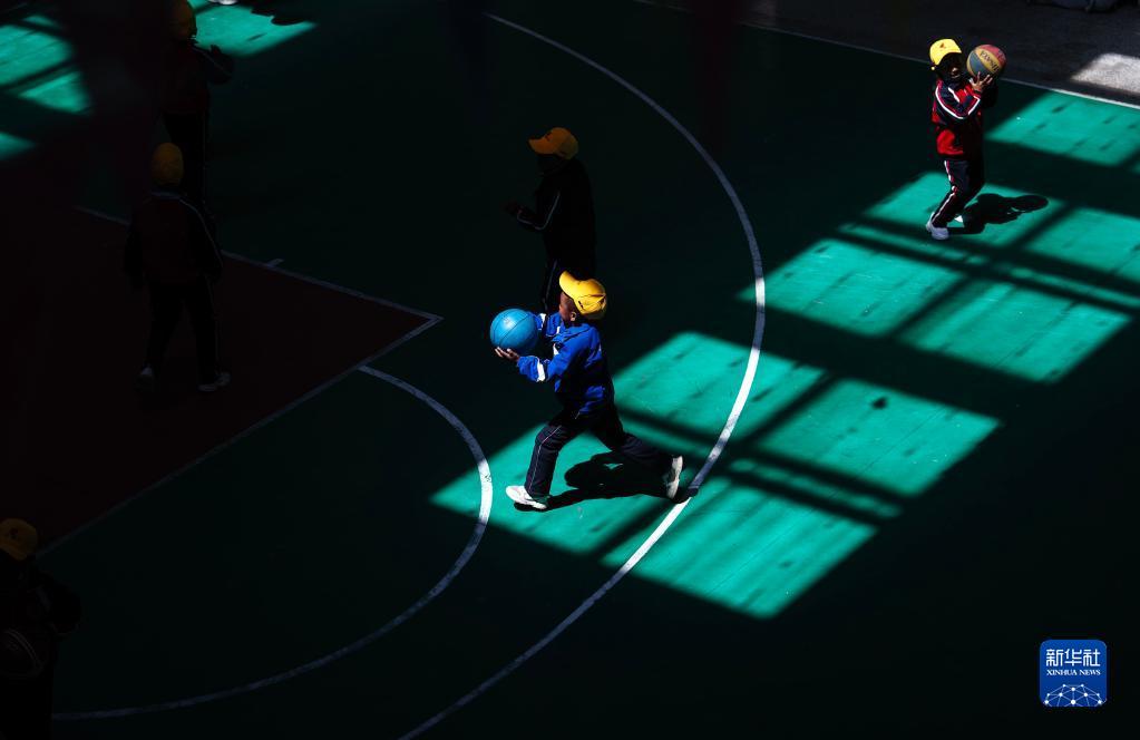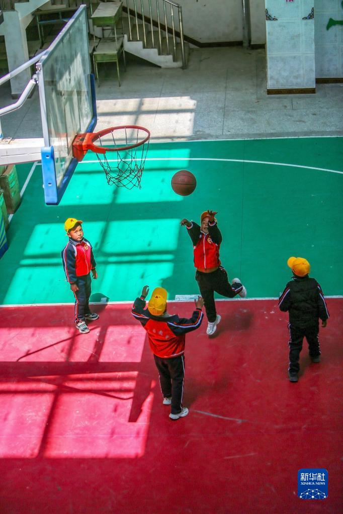 6月5日,扎西宗鄉(xiāng)完全小學(xué)的學(xué)生在室內(nèi)體育館上籃球課。新華社記者 費茂華 攝