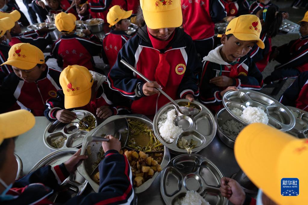 6月5日,扎西宗鄉(xiāng)完全小學(xué)的學(xué)生在食堂吃午飯。新華社記者 費茂華 攝