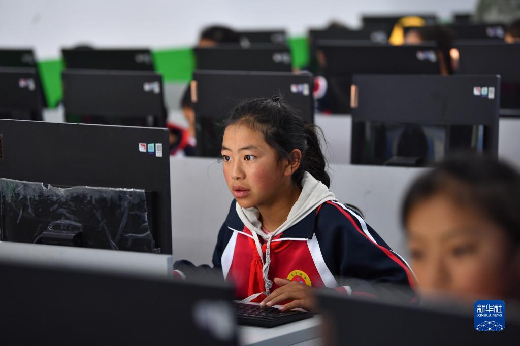 扎西宗鄉(xiāng)完全小學(xué)的學(xué)生在上計算機課(6月5日攝)。新華社記者 晉美多吉 攝