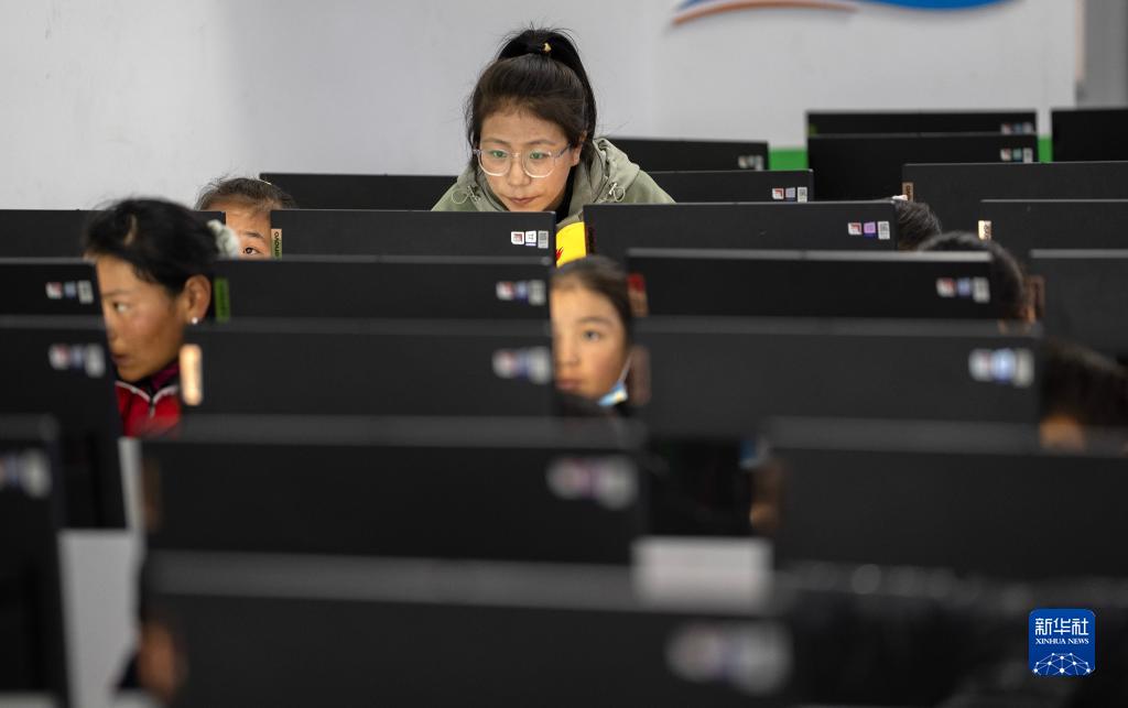 6月5日,拉巴卓瑪老師在給扎西宗鄉(xiāng)完全小學(xué)六年級的學(xué)生上計算機課。新華社記者 費茂華 攝