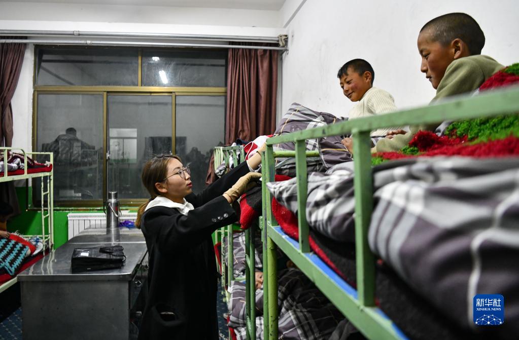 扎西宗鄉(xiāng)完全小學(xué)的值班老師在檢查孩子睡覺時是否蓋好被子(6月5日攝)。新華社記者 晉美多吉 攝