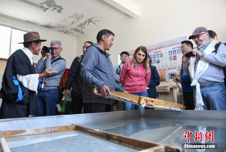 6月15日,西藏拉薩,記者們在尼木縣非遺工坊(藏紙制作廠)采訪了解藏紙。在第五屆中國西藏旅游文化國際博覽會召開之際,國務(wù)院新聞辦組織中外媒體記者赴西藏采訪,路透社、共同社、西班牙埃菲社、意大利安莎社、新加坡《聯(lián)合早報》和中央廣電總臺、中國日報等15家媒體的20名記者參加。6月15日,采訪團一行前往拉薩市尼木縣參訪體驗西藏傳統(tǒng)藏香、藏紙文化。