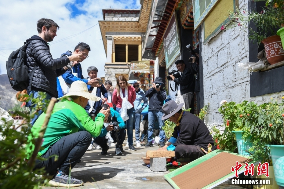 6月15日,西藏拉薩,中外記者們在尼木縣吞巴鎮(zhèn)吞達村采訪拍攝藏香制作過程。在第五屆中國西藏旅游文化國際博覽會召開之際,國務(wù)院新聞辦組織中外媒體記者赴西藏采訪,路透社、共同社、西班牙埃菲社、意大利安莎社、新加坡《聯(lián)合早報》和中央廣電總臺、中國日報等15家媒體的20名記者參加。6月15日,采訪團一行前往拉薩市尼木縣參訪體驗西藏傳統(tǒng)藏香、藏紙文化。