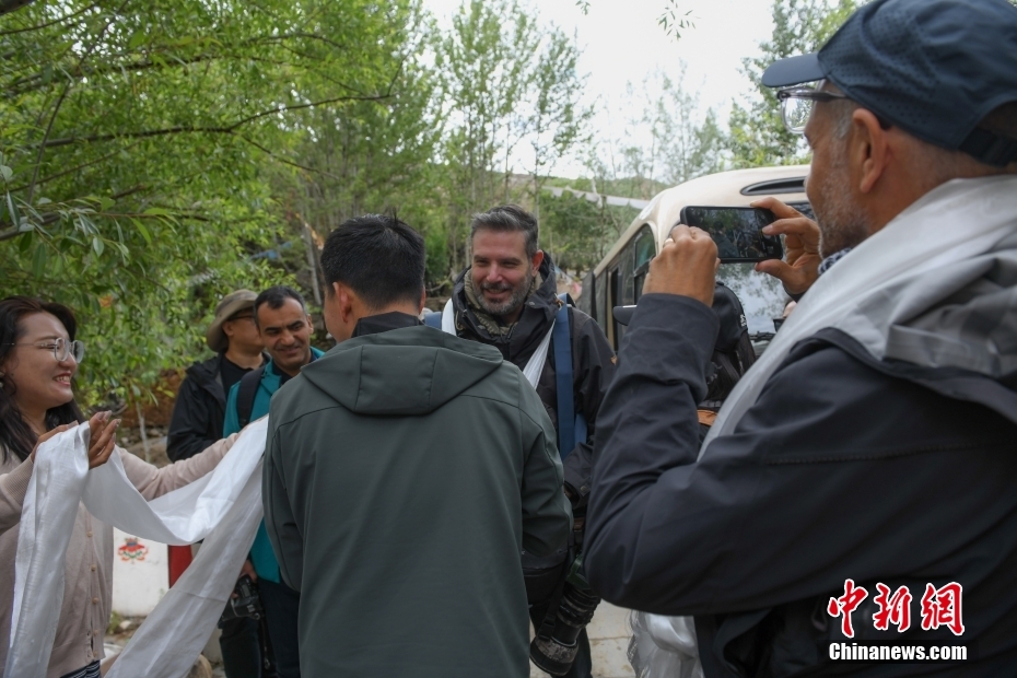 6月15日,西藏拉薩,尼木縣吞巴鎮(zhèn)吞達村村民給來訪記者們敬獻哈達,表示歡迎。在第五屆中國西藏旅游文化國際博覽會召開之際,國務(wù)院新聞辦組織中外媒體記者赴西藏采訪,路透社、共同社、西班牙埃菲社、意大利安莎社、新加坡《聯(lián)合早報》和中央廣電總臺、中國日報等15家媒體的20名記者參加。6月15日,采訪團一行前往拉薩市尼木縣參訪體驗西藏傳統(tǒng)藏香、藏紙文化。