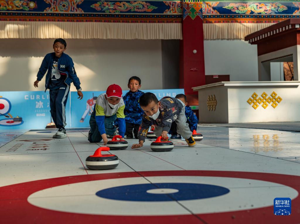6月17日,幾名孩子在第五屆藏博會現(xiàn)場體驗(yàn)冰壺。新華社記者 孫非 攝