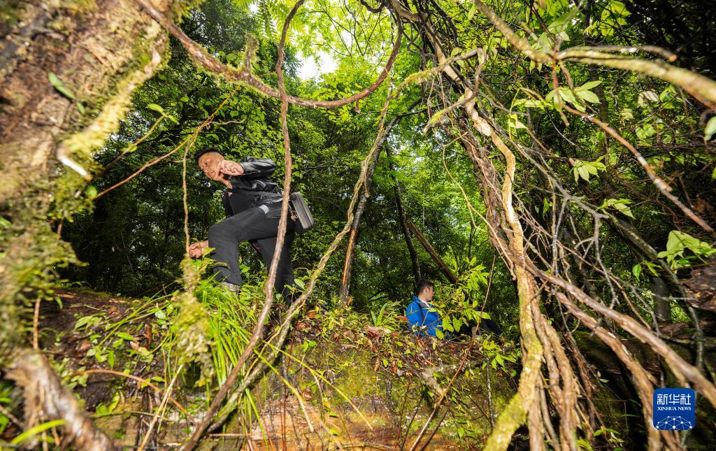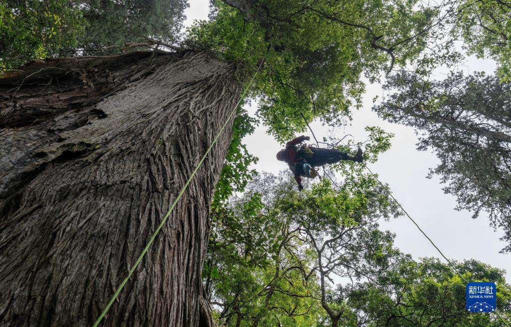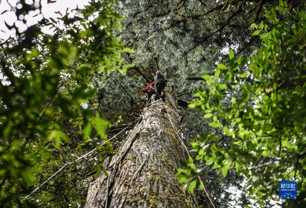6月15日,國(guó)家重要野生植物種質(zhì)資源庫辰山中心負(fù)責(zé)人鐘鑫(下)和助手在攀爬亞洲第一高樹附近的高樹,采集數(shù)據(jù)。新華社記者 晉美多吉 攝