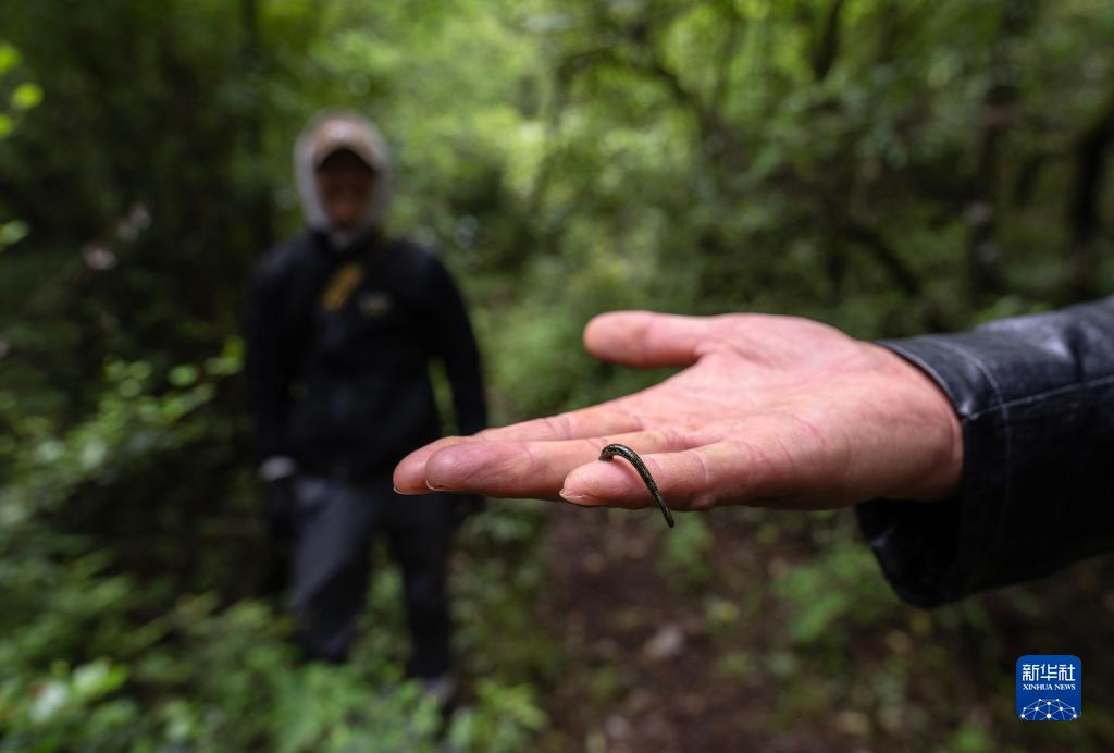 6月15日,波密縣林草局工作人員西繞在路程中被一只螞蟥咬住手指。新華社記者 費(fèi)茂華 攝