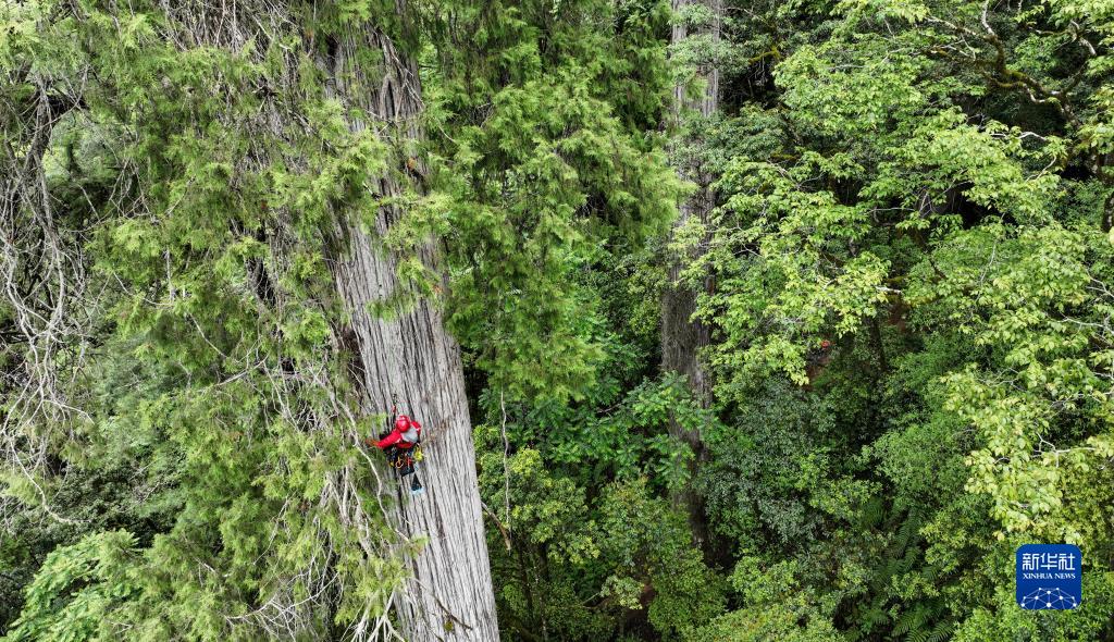 6月15日,攀樹專家劉團(tuán)璽在攀爬亞洲第一高樹(無人機(jī)照片)。新華社記者 晉美多吉 攝