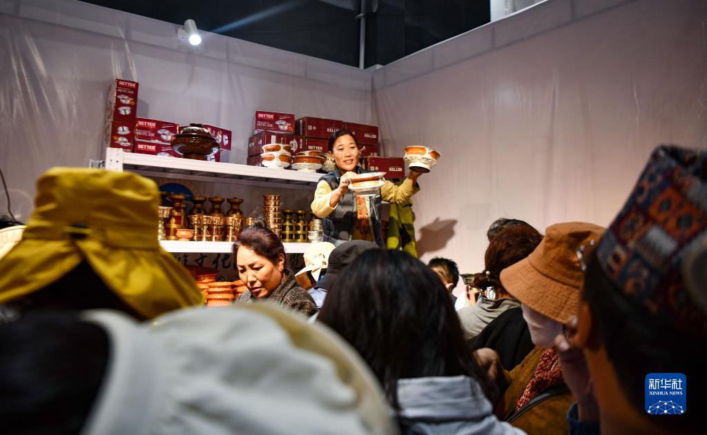 展會上的不丹商人向顧客銷售不丹服裝和木碗(6月18日攝)。新華社記者 晉美多吉 攝