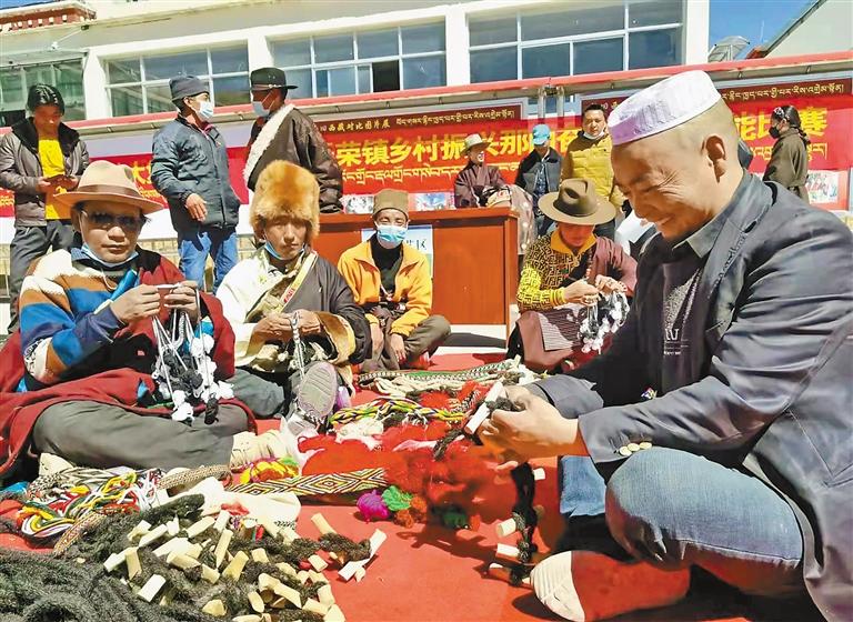 這是在那曲市聶榮縣聶榮鎮(zhèn)“鄉(xiāng)村振興 那曲奮進(jìn)”活動中,藏族群眾和回族群眾在交流手工藝品的制作方法。