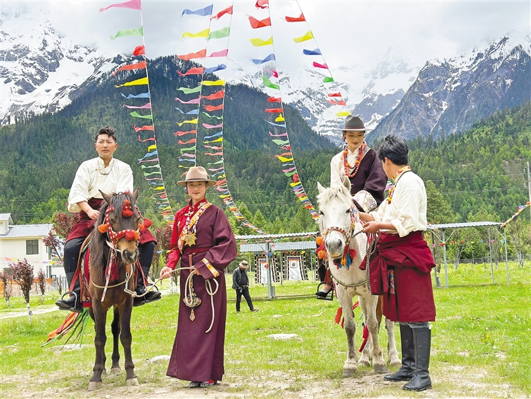 波密縣扎木鎮(zhèn)康木村坐落于318國(guó)道旁,風(fēng)景秀麗,群山環(huán)繞,很多自駕游的游客都會(huì)經(jīng)停于此體驗(yàn)藏家文化。圖為游客在康木村,穿著藏裝體驗(yàn)騎馬樂趣。 圖片由記者 張猛 攝