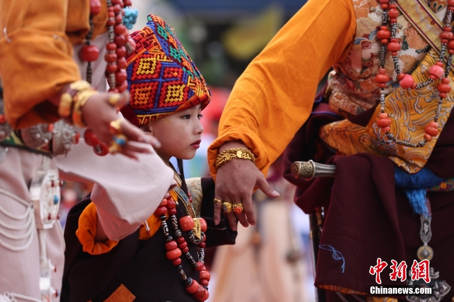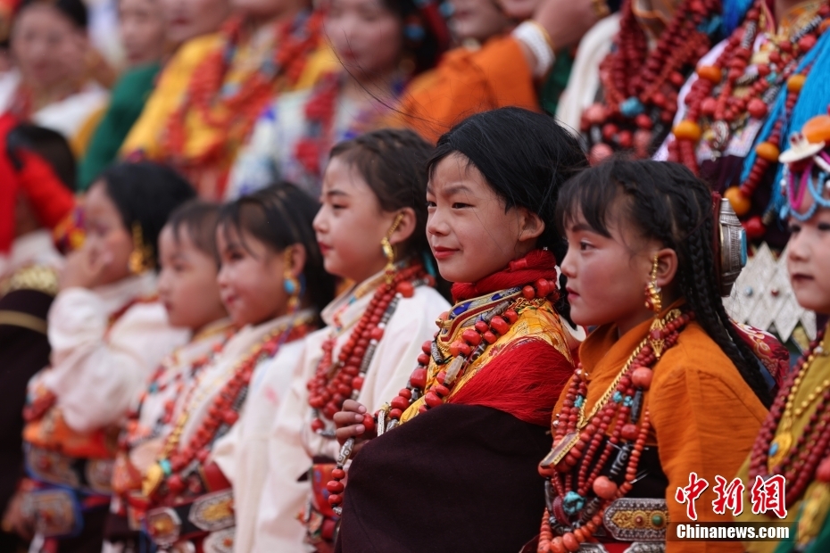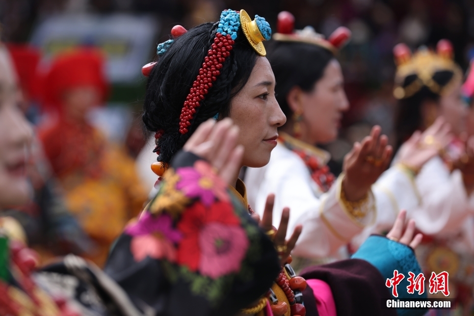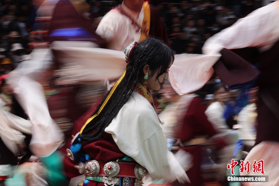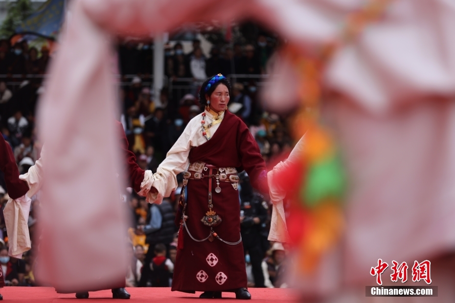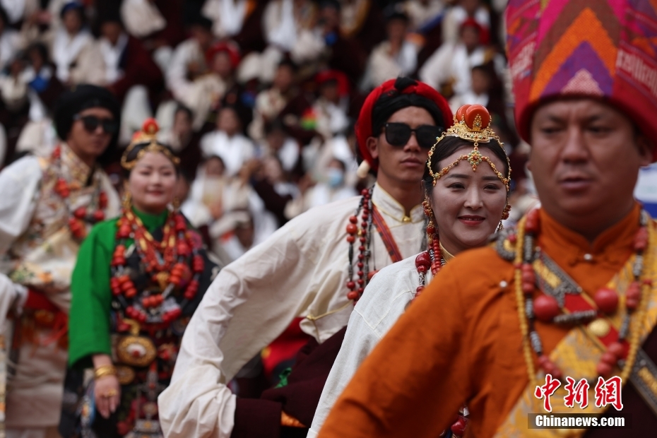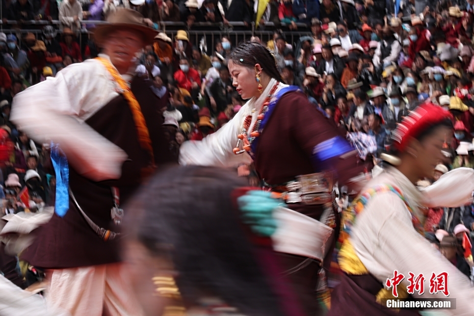 7月17日,西藏自治區(qū)昌都市貢覺縣,民眾身著極具特色的民族服裝服飾,載歌載舞出席當(dāng)?shù)氐奶厣椪够顒?dòng)。