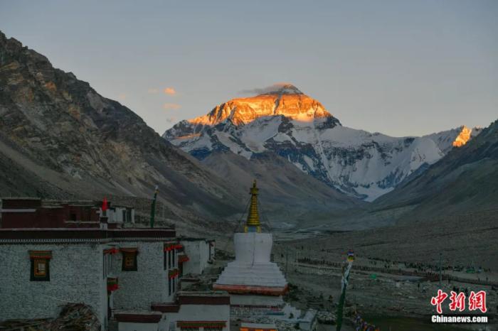 位于西藏日喀則市定日縣的世界第一高峰珠穆朗瑪峰顯露出“日照金山”的美景。貢嘎來松 攝