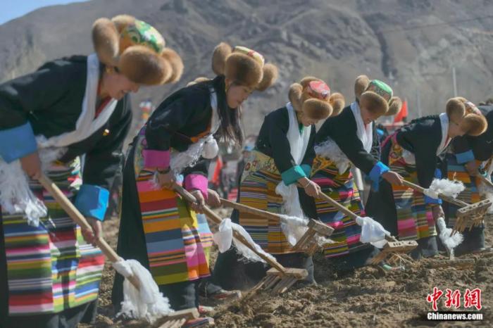 2021年3月16日,藏歷鐵牛年二月初三,西藏自治區(qū)拉薩市堆龍德慶區(qū)德慶村的上百位村民身著盛裝舉行傳統(tǒng)春耕儀式。貢嘎來松 攝