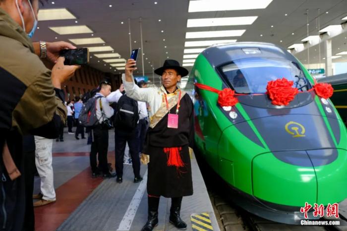 2021年6月25日,川藏鐵路拉林段(拉林鐵路)正式開通運營。民眾在拉薩火車站復(fù)興號車頭前自拍留念。江飛波 攝