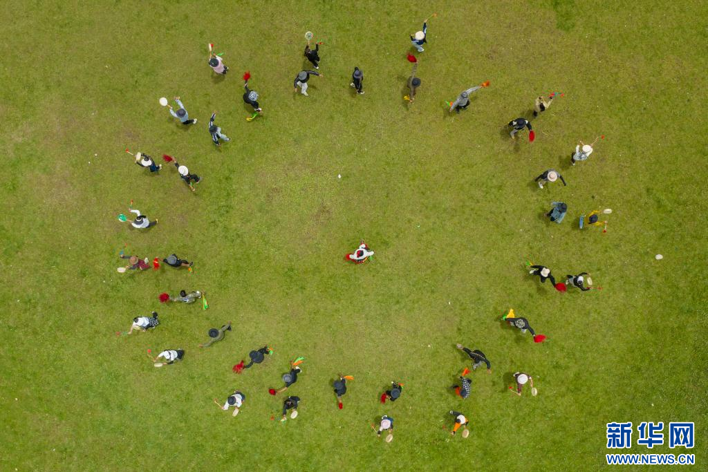 7月12日,西藏昌都市丁青縣尺犢鎮(zhèn)烏巴村文藝演出隊(duì)在排練(無人機(jī)照片)。 新華網(wǎng) 旦增努布 攝