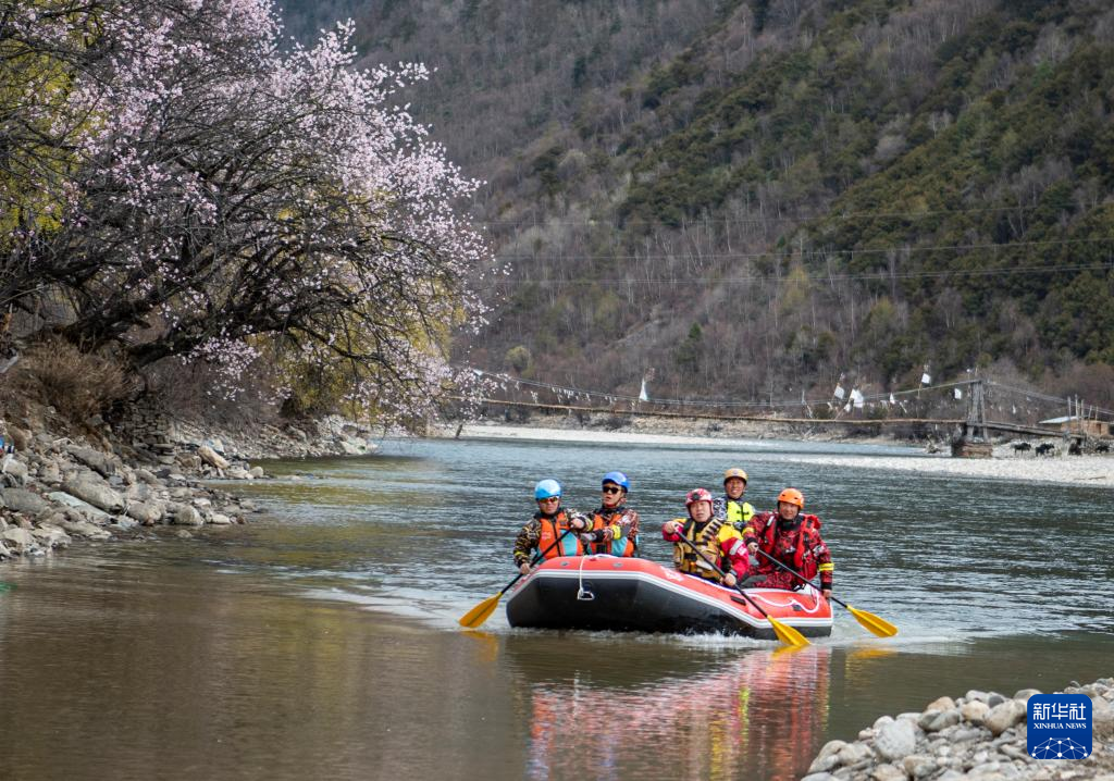 扎史品初(右二)和隊友在巴河上漂流(4月13日攝)。新華社記者 孫非 攝