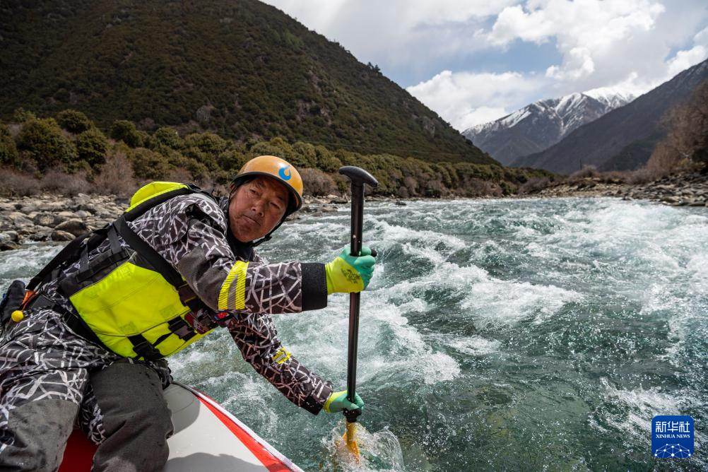 扎史品初正在巴河上漂流(4月14日攝)。新華社記者 孫非 攝