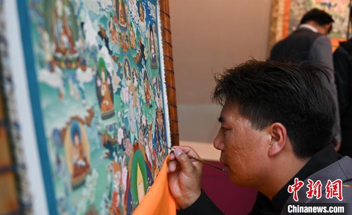 圖為活動(dòng)現(xiàn)場(chǎng),唐卡畫(huà)師展示唐卡繪制。趙朗 攝