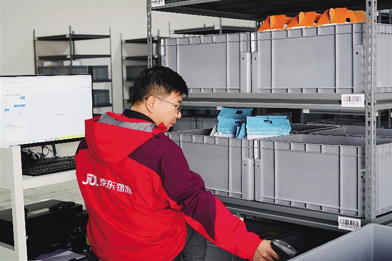 京東物流工作人員在林芝農(nóng)產(chǎn)品前置智能倉(cāng)內(nèi)揀選貨物。