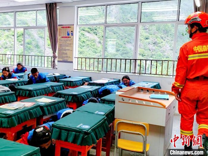 同學(xué)們?cè)谙绬T的指導(dǎo)下進(jìn)行地震避險(xiǎn)演練。李國(guó)燾 攝