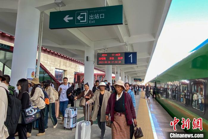 圖為8月30日暑運(yùn)期間,旅客在西藏日喀則站乘坐高原復(fù)興號(hào)動(dòng)車組出行。日喀則火車站 供圖