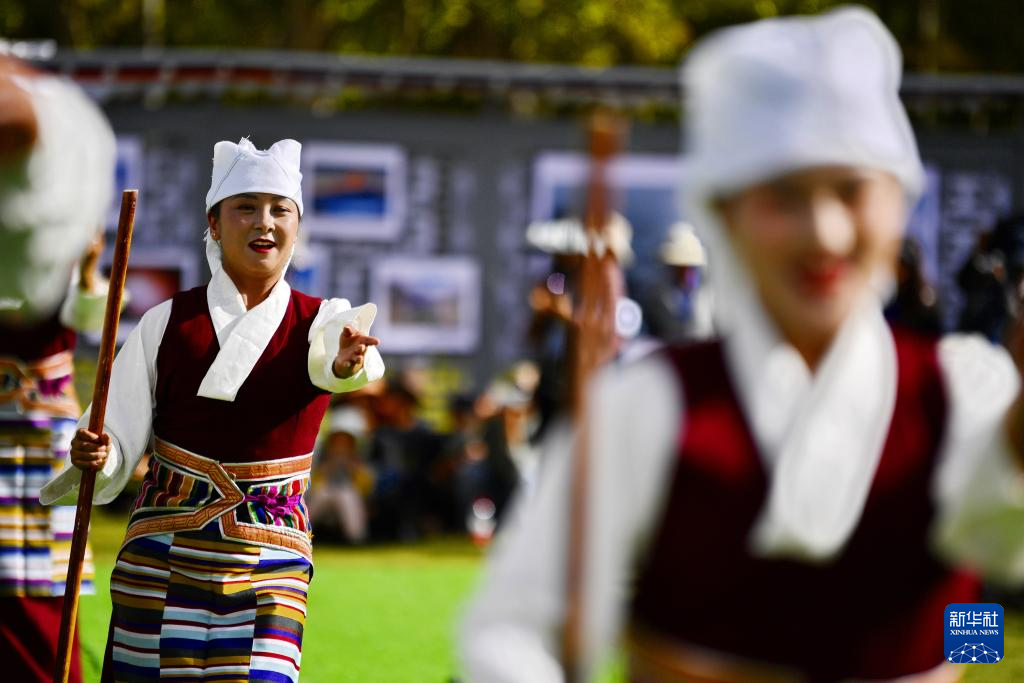 在拉薩市林周縣邊交林鄉(xiāng)當(dāng)杰村,演員在第十六屆西藏珠穆朗瑪攝影大展開(kāi)幕式上表演節(jié)目(9月8日攝)。新華社記者 張汝鋒 攝